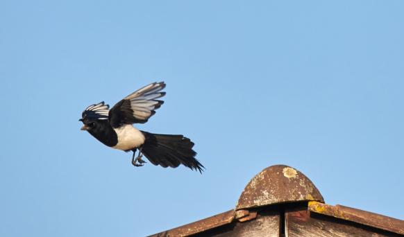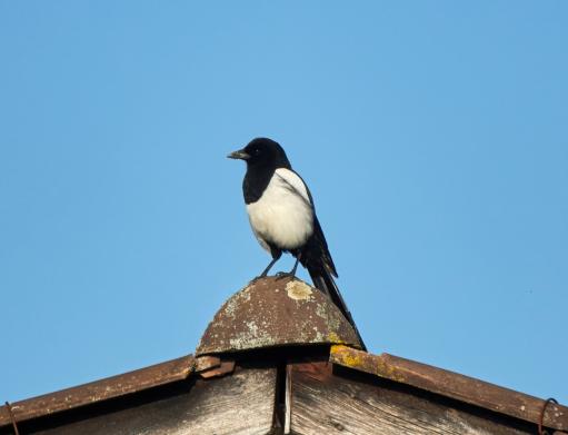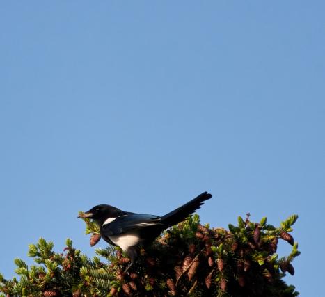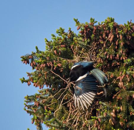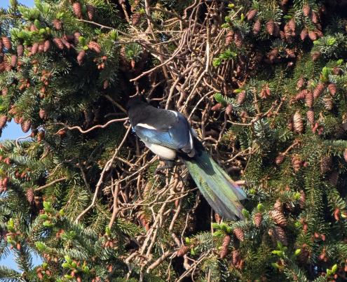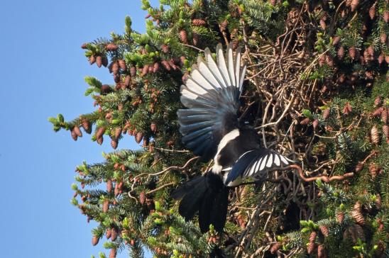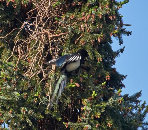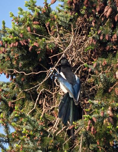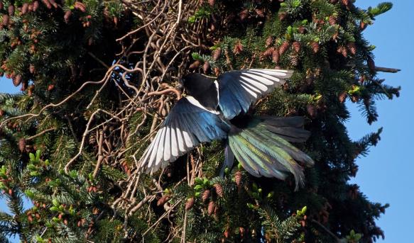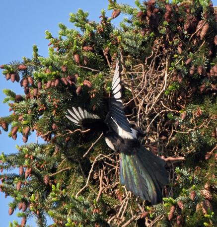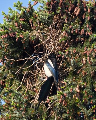 Die Elster hat wie jedes Jahr ihr Nest in der Tanne gebaut.