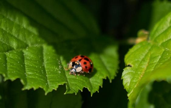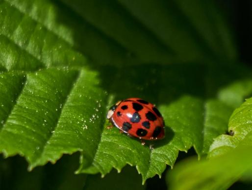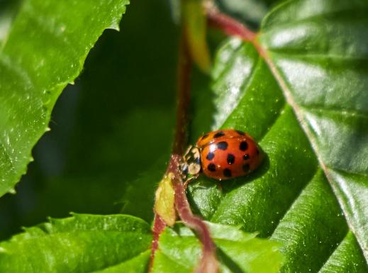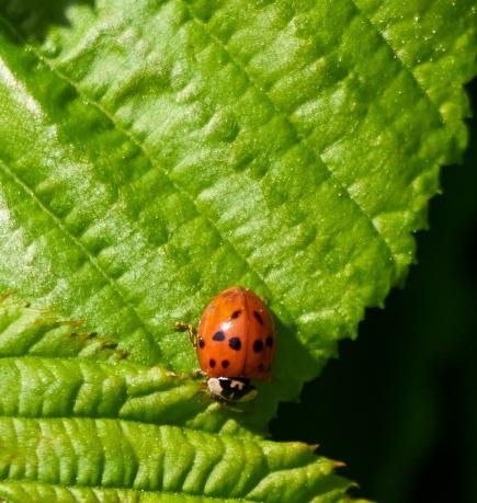 Der kleine Marienkäfer geniesst die Sonne auf den Blättern,
